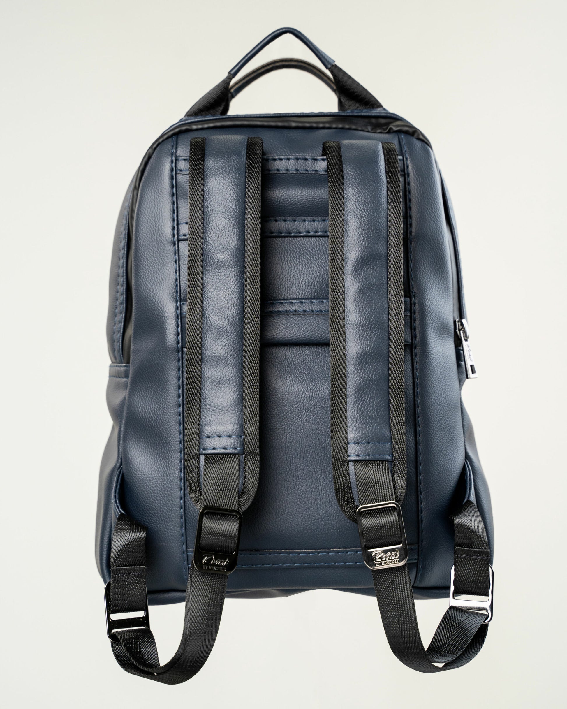 Business travel backpack for men and women, made in Jamaica from 100% vegan leather sized to fit into small spaces and overhead bins with multiple compartments and trolley sleeve, water-resistant bookbag and computer backpack fits up to 13-inch laptop notebook, available in 8 standard colours with the option to personalize.