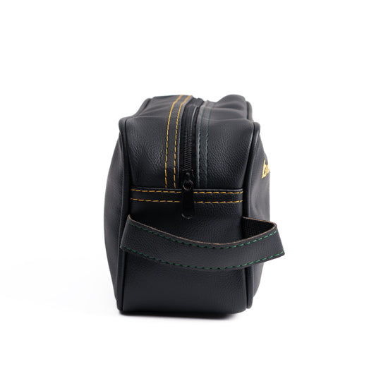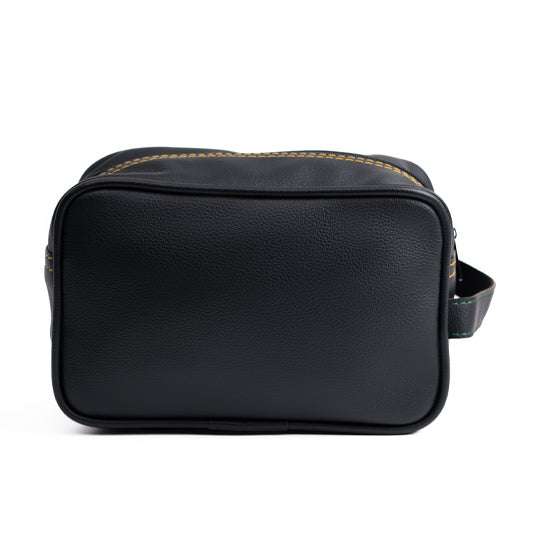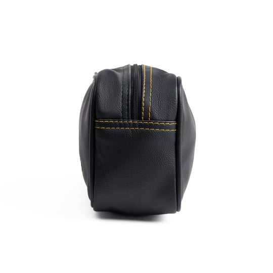 Unisex personal care cosmetic pouch made in Jamaica from lightweight and durable vegan leather, lined with cruelty-free materials featuring inner compartments and zipper closure, available in 4 standard colours with the option to personalize.
